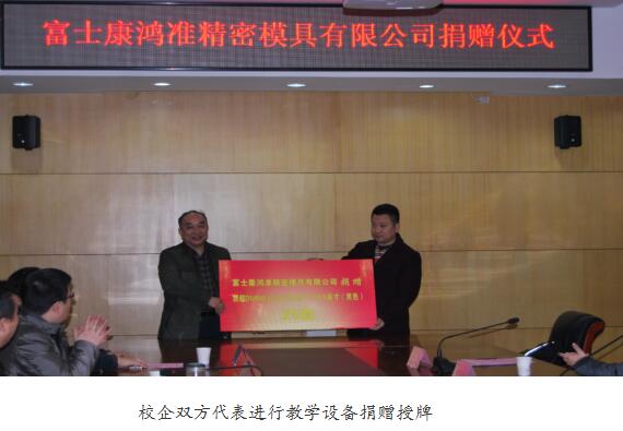 仪式上, 胡成龙院长介绍了富士康鸿准精密模具有限公司与我校校企合作及教学设备捐赠的基本情况;郑国辉经理重点阐述了公司目前重点业务项目和校企合作方向。校企双方代表就教学设备捐赠进行授牌,模具1502班余昌新同学就富士康订单班学习情况进行汇报。
