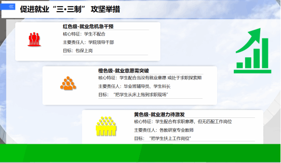 为破解就业难题,学院创新推出“三·三制”攻坚战术,按就业困难程度分为红、橙、黄三级,匹配学院领导干部、辅导员就业团队、各教研室专业老师三支队伍针对性逐级突破。