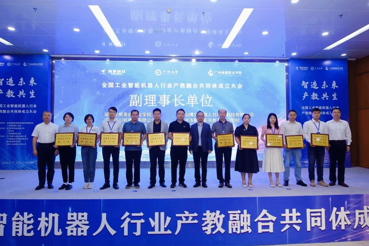 (通讯员 刘依)2026年4月11日,全国工业智能机器人行业产教融合共同体成立大会在广州隆重召开。武汉软件工程职业学院(以下简称“武软”)作为“副理事长单位”受邀参会并接受现场授牌。机械工程学院智能机器人教研室主任刘依博士出席本次盛会,与来自全国政府部门、行业协会、高校、科研机构及龙头企业的400余位嘉宾共同见证这一产教融合里程碑时刻。