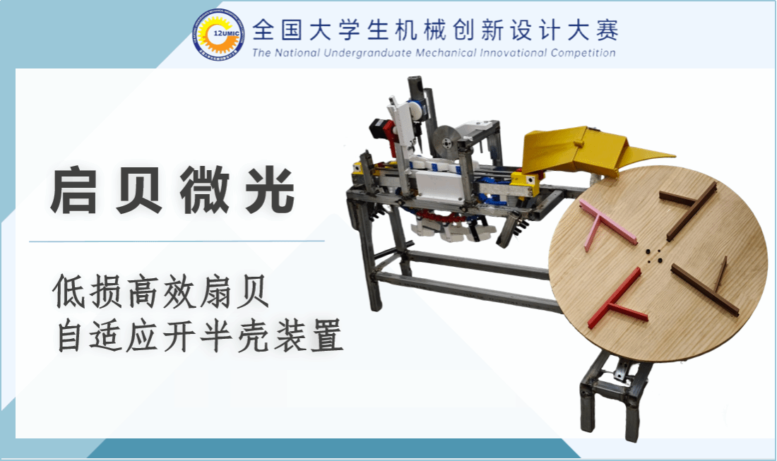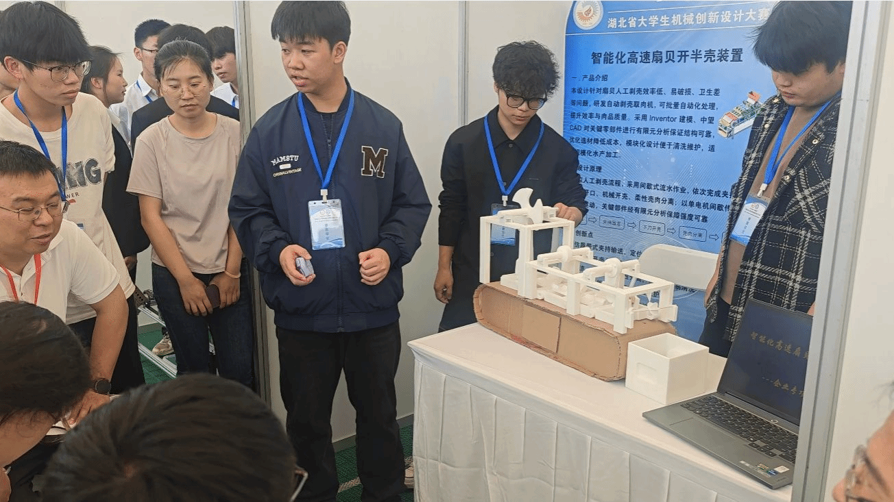 在水产品初加工机械赛道,机械工程学院的两支参赛队伍同样表现亮眼。“启贝微光扇贝开半壳装置”针对传统扇贝开壳效率低、贝肉易受损等行业痛点,采用自适应夹紧与精准开壳结构,有效提升加工效率与产品品质一致性,荣获二等奖;“智能化高速扇贝开半壳装置”进一步优化传动效率与自动化程度,实现扇贝批量、高速开壳处理,适配规模化生产需求,斩获三等奖。两款作品均贴合水产品加工产业实际,彰显了创新设计的实用价值与产业适配性。