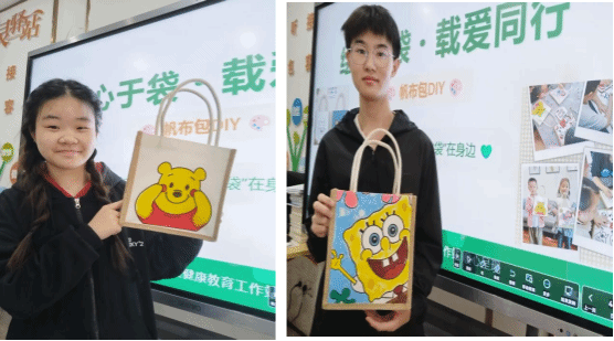 “绘心于袋,载爱同行”麻布袋DIY环节备受欢迎。同学们手持丙烯颜料,一笔一画勾勒心中所想,将温暖、治愈、励志的图案与文字绘于袋上,把情绪表达转化为创意作品,把美好与力量“袋”在身边。