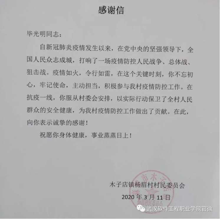 3月10日,他结束了为期22天的志愿服务,因表现出色,收到了麻城市木子店镇杨眉村委员的感谢信。