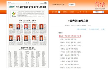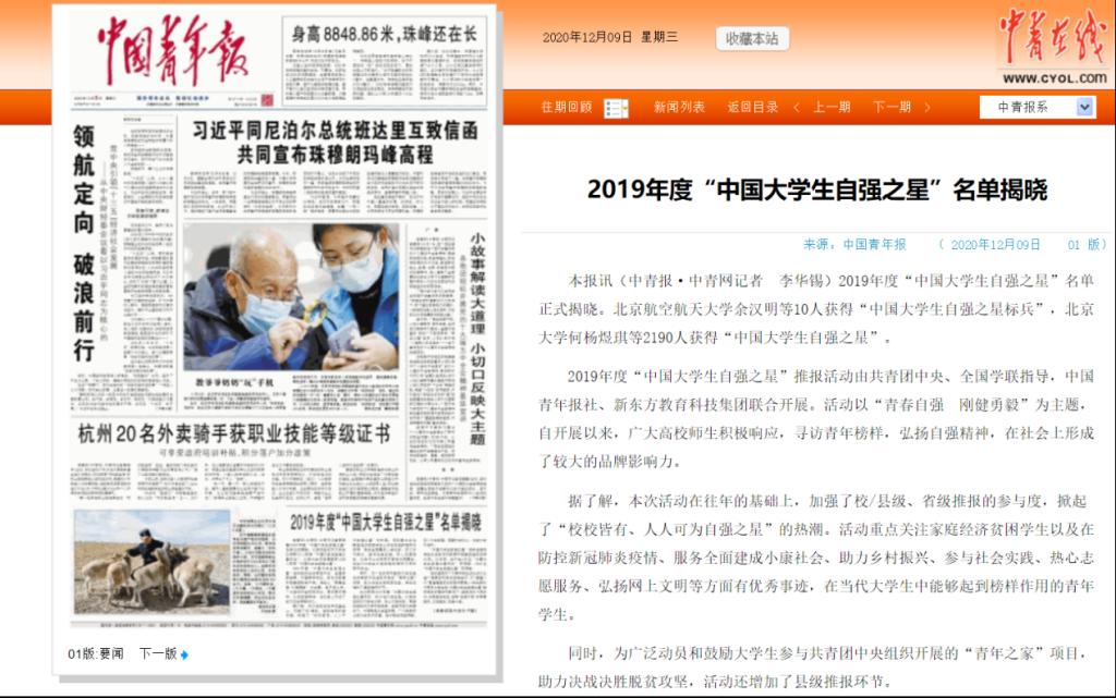 (通讯员 邓玲)昨日,《中国青年报》头版揭晓了2019年度“中国大学生自强之星”名单,我院模具与设计专业1802班陈澳同学荣获“中国大学生自强之星”称号。