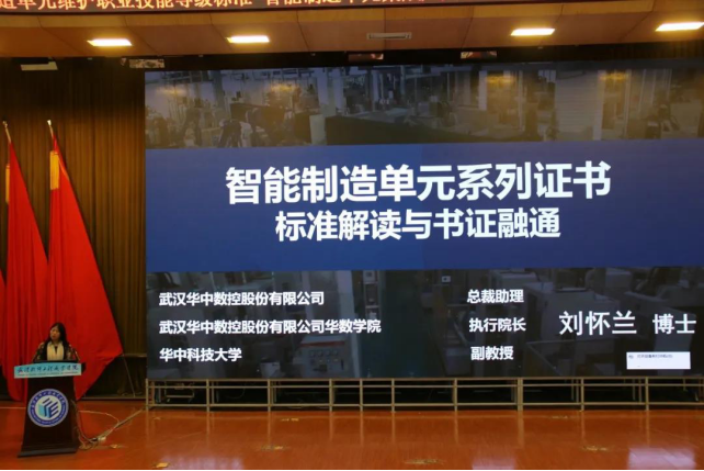 华中数控总裁助理、华数学院执行院长刘怀兰详细介绍书证融通及课程体系建设、人才培养、专业建设及发展方向情况。华数学院副院长孙海亮针对智能制造证书试点工作申报流程及相关标准、注意事项等推进计划进行介绍。