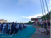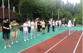 活动第五项,运动后拉伸。两公里跑步结束后,同学们再次集合,重整队伍,由马俊老师带领同学们进行运动后肌肉放松训练。
