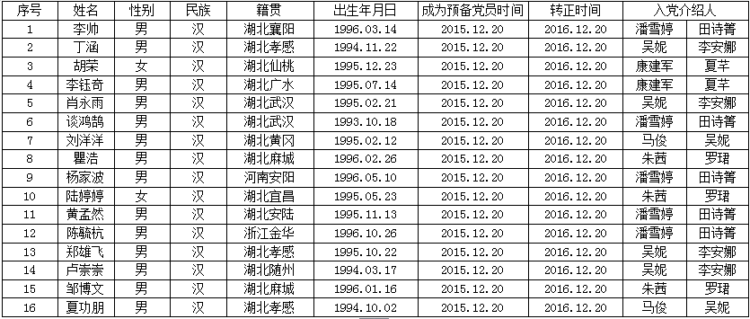 在听取党小组和党员、群众意见的基础上,经支部委员会审查,拟将李帅等16名同志转为中共正式党员。根据发展党员工作有关要求,现将其有关情况公示如下: