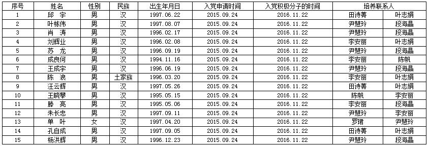 经支部委员会研究,报上级党委备案同意,将邱宇等15名同志列为发展对象。根据发展党员工作有关要求,现将有关情况公示如下: