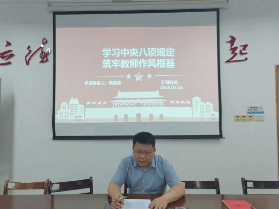 (通讯员 卢佳)为深入推进作风建设,强化教师队伍纪律意识与责任担当,2025年7月3日下午,机械工程学院院长蒋保涛在综合楼402会议室给教师党员们讲授了以《学习中央八项规定,筑牢教师作风根基》为主题的党课。