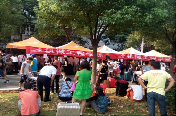 早晨七点,学校的主干道便开始出现了机械学院成员和迎新志愿者的身影,他们将现场布置、物品陈设、服务流程与人员安排一一实现,早在新生报道之前,他们就共同坚守在自己的岗位上,静候15级新鲜的面孔、蓬勃的朝气。熬过十年寒窗苦,新生们按捺不住对大学的期待,早早就现身在迎新的现场,入学工作还没开始,工作台前已经排满了前来报道的新同学。