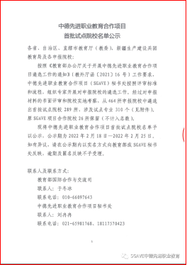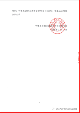 中德先进职业教育合作项目(简称SGAVE项目)是教育部与德国等欧洲职业教育模式先进国家行业龙头企业联合实施的职业教育合作项目。该项目深化产教融合、校企合作,深入推进育人方式、办学模式、管理体制、保障机制改革,借鉴“双元制”办学模式,提升职业院校产教融合、校企合作与国际交流水平,打造高素质技术技能人才培养国际合作精品,为我国制造业转型升级和高质量发展奠定人才基础。