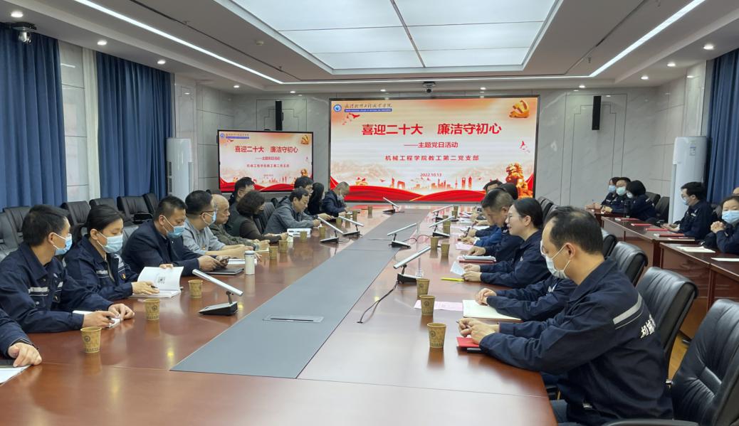 2022年10月13日13:30分,武汉软件工程职业学院机械工程学院教工第二党支部在行政楼3楼会议室开展了“喜迎党的二十大,廉洁守初心”为主题的党日活动,校党委副书记、纪委书记、监察专员郭友鹏、纪委副书记王晓辉、组织部副部长叶志娟、各学院党总支书记、副书记以及机械工程学院院长王中林、党总支书记戴永清、党总支副书记陆军、机械工程学院教工第二党支部党员参加了此次活动。