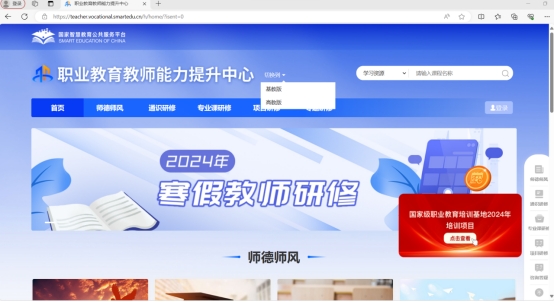 第一步:登录“国家智慧教育公共服务平台”(https://teacher.vocational.smartedu.cn),选择专题研修登录