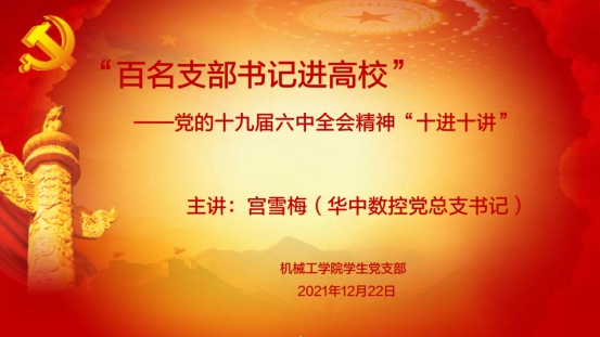 12月22日下午3点,机械工程学院学生党支部在学术楼1号报告厅,邀请武汉华中数控股份有限公司党委委员兼党总支宫雪梅书记主讲了《不忘初心 牢记使命 学习十九届六中全会决议精神》的专题党课。本次党课由学生党支部书记李安丽主持。 院党总支书记戴永清、学生科科长段海晶、团总支书记邓玲及全体辅导员,与学生支部预备党员、入党积极分子和团学干部一道参加了宣讲会。